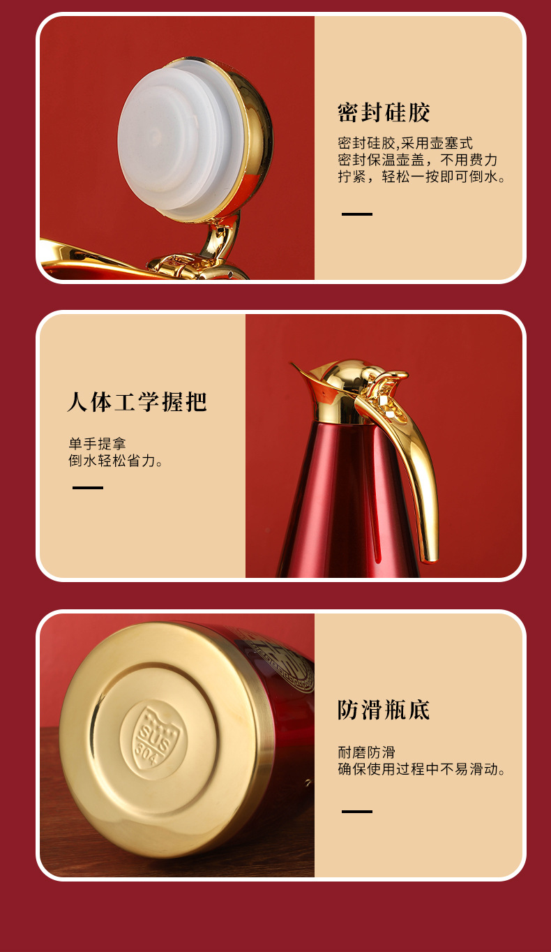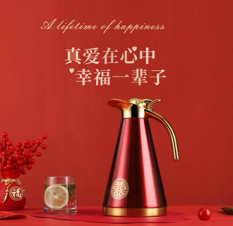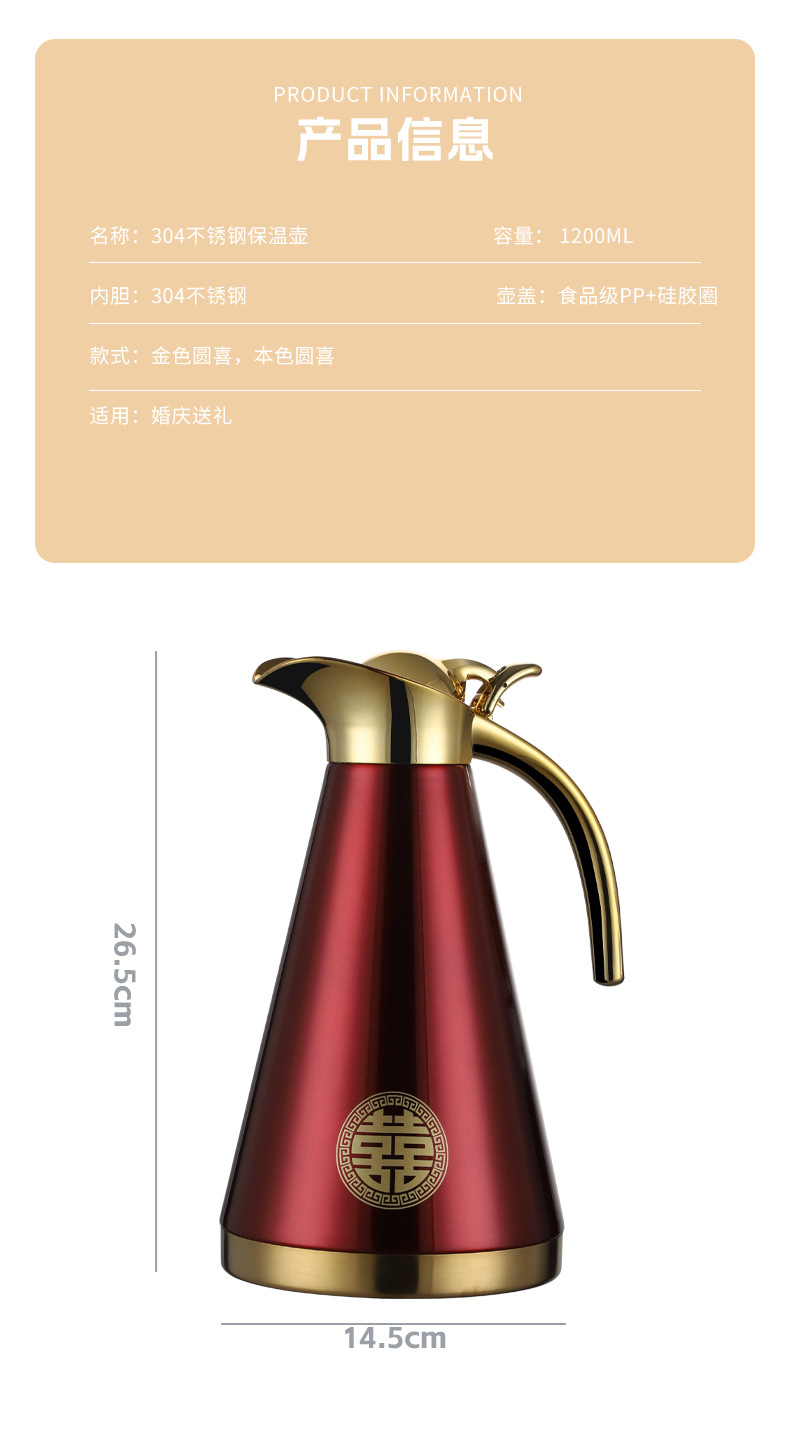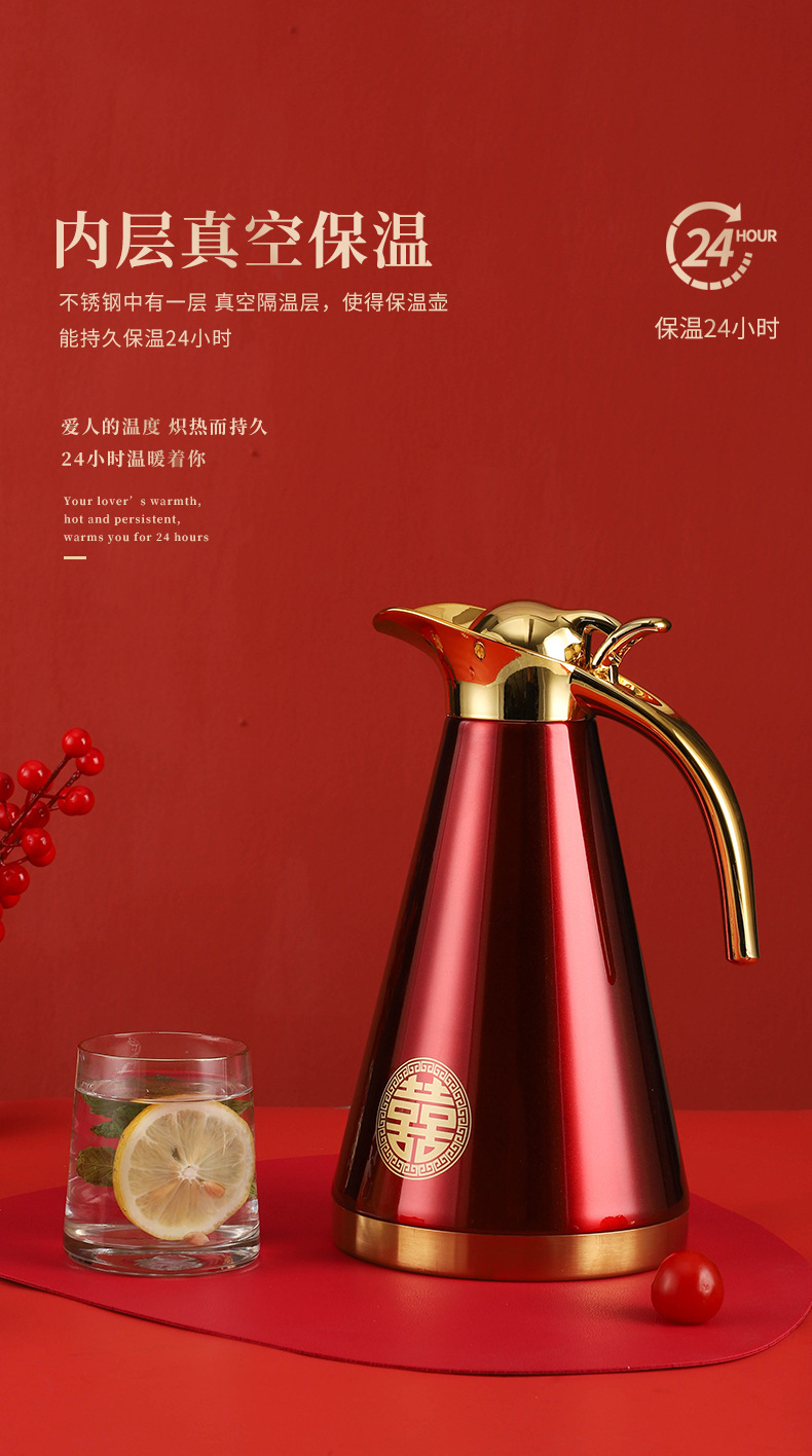 不锈钢婚庆保温壶金色手柄欧式壶双层真空家用暖水瓶陪嫁铂金壶1.