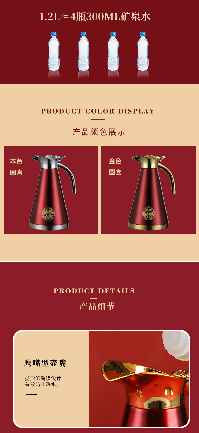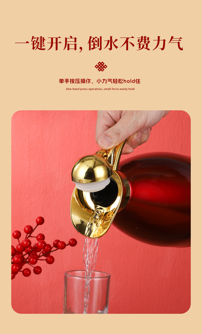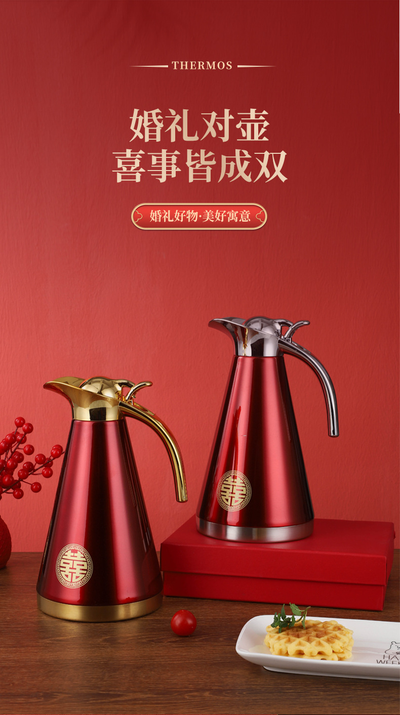 不锈钢婚庆保温壶金色手柄欧式壶双层真空家用暖水瓶陪嫁铂金壶1.